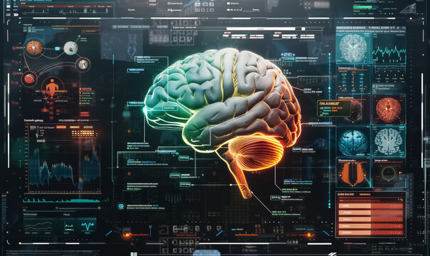Futuristic data analysis with rotating 3d brain hologram