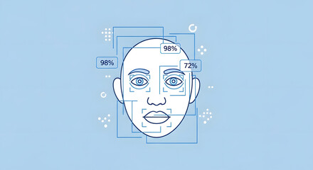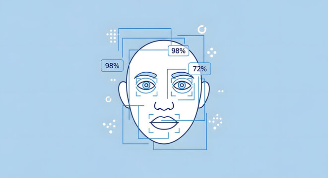 Illustration depicting facial recognition technology, highlighting the detection of facial features and percentage accuracy.