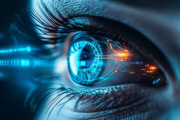 Macro photography of a human eye with holographic hud and intricate iris patterns in blue light