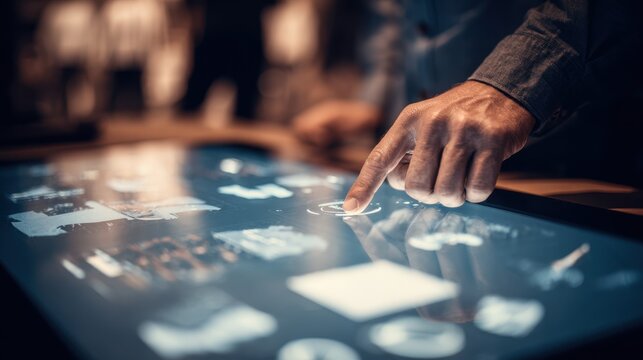 View of a shopper interacting with a touchscreen checkout terminal main object sharp with background softly blurred emphasizing userfriendly selfservice technology.