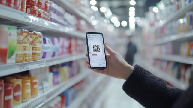 Web banner of modern shopping. Close up of caucasian woman scans qr code of product using smartphone. Shelves with food and aisle in background. Copy space and mock up