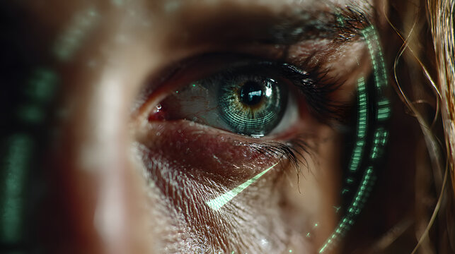 Close-up of a person's iris with a futuristic scanning reticle analyzing unique features of the eye