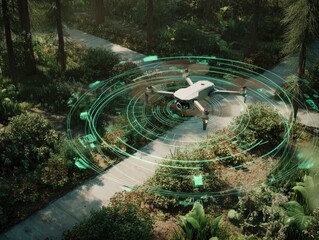 Futuristic drone hovering above city skyline at dusk