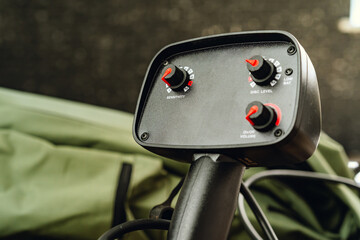 Metal detector tool on concrete background close up
