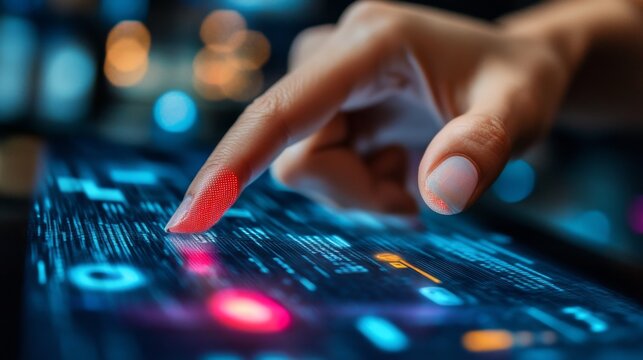 Woman finger touching futuristic interactive screen with fingerprint scanning technology
