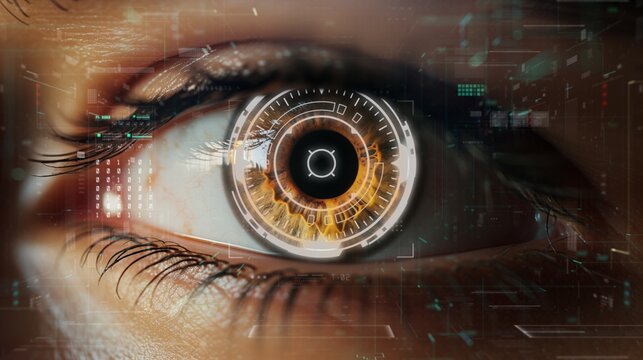 Close-up of human eye with digital interface and medical cross symbol representing vision technology