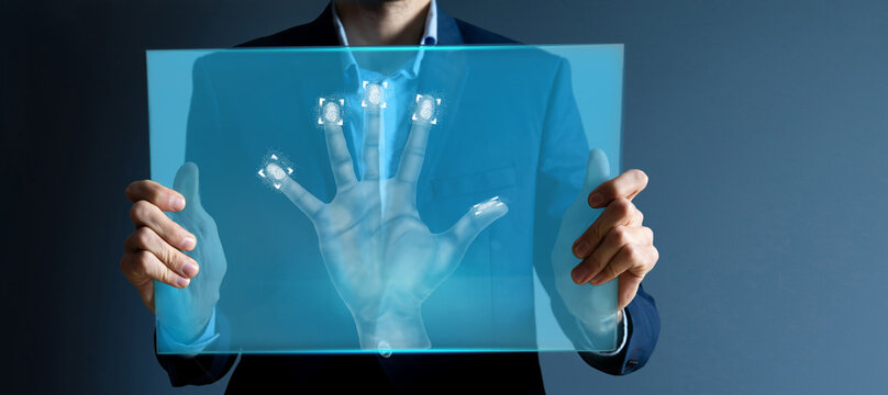 Futuristic fingerprint scanning on digital grid interface