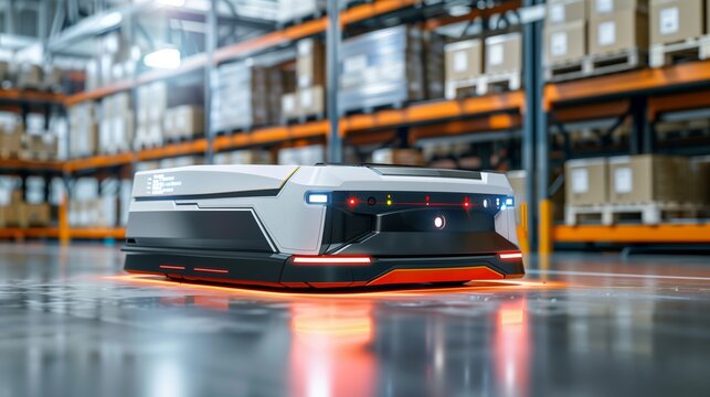 A futuristic AGV uses artificial intelligence to scan barcodes while navigating a data-integrated shipping warehouse.