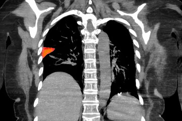 Color-enhanced CT scan showing wedge-shaped pulmonary infarction in right lung of a patient with pulmonary embolism