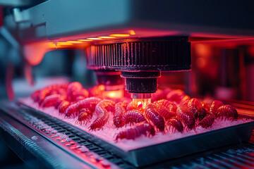 Frozen mealworms undergoing analysis under specialized cold lab equipment with red illumination in a biotech lab
