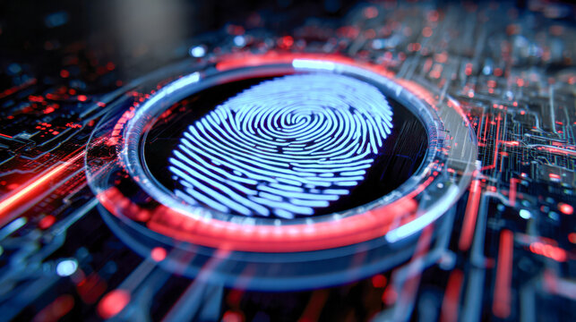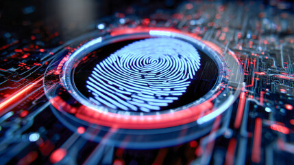 Futuristic biometric security system with glowing fingerprint scanner integrated on high-tech circuit board in digital data protection concept