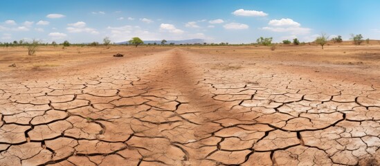 Arid landscape featuring cracked earth depicting drought conditions and scarce vegetation under a clear sky environment