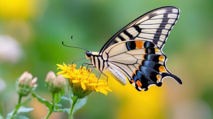 Beautiful scarce swallowtail butterfly resting on a vibrant wildflower blossom