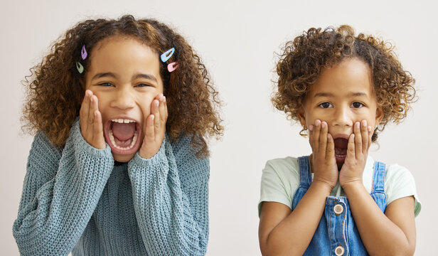 Boy, girl and children in studio with shock or surprise, wow hands for omg emoji or excited scream. Kids, white background and portrait with open mouth for crazy shout, amazing news or announcement