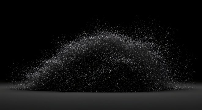 A dense cloud of fine white particles or droplets disperses into individual points against a dark blurred background illuminated to highlight the mists movement