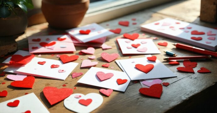 Stacked red cards with heart cutouts scattered with illuminated golden speckles decorations