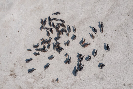 Aerial view of dark forms scattered across a pale, textured surface, creating a stark contrast of light and shadow, Sariakandi, Rajshahi Division, Bangladesh.