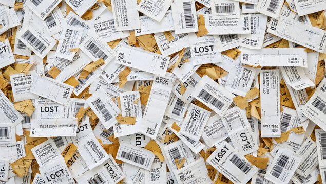 Pile of Lost Luggage Tags with Barcodes and Text