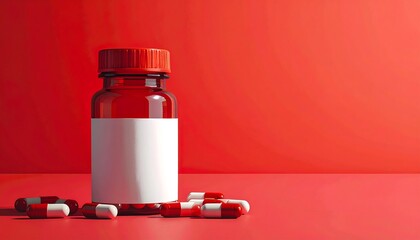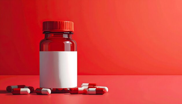 A red medicine bottle with a blank white label sits amidst scattered red and white capsules against a vibrant red background.