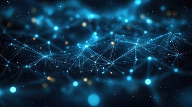 Abstract network of interconnected nodes and lines, dark blue background with scattered golden dots