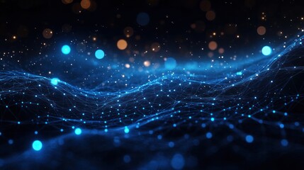 Abstract digital network with interconnected blue glowing nodes and lines creating a wave-like structure against dark background with scattered light orbs