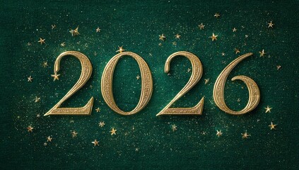 Gold glittery 2026 text on dark background with blue and orange dots sparkle