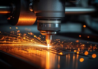 close-up of a laser cutting head slicing a metal sheet, bright orange sparks and molten droplets scattering across the reflective surface, conveying intense precision and industrial energy
