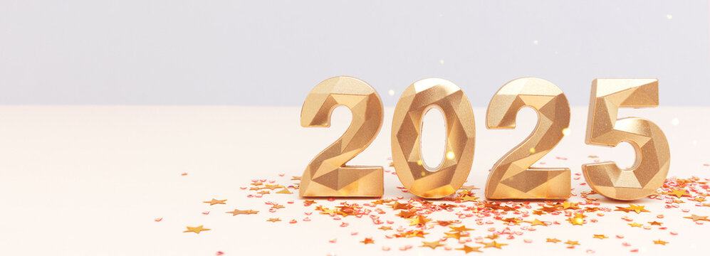 2025 New Year. Banner with golden numbers in front of blue and beige background.