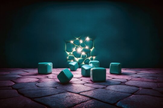 A scattered collection of irregularly shaped, grey and beige stones, varying in size and exhibiting subtle textural differences. They appear to be fragments of a larger object or formation