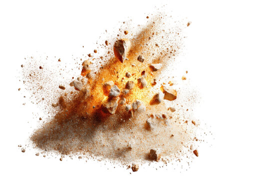 Flying rocks and scattered debris captured mid-air isolated on a clean bright white background
