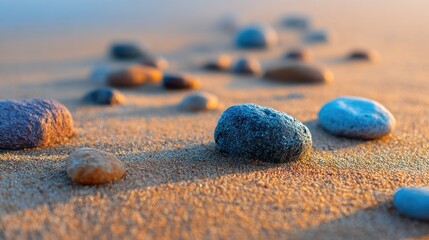 A collection of rocks scattered on a sandy beach, with a warm, golden hue and a few blue stones in the foreground.
