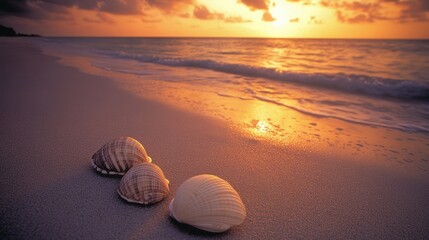 A tranquil beach at sunset, with the sky ablaze with shades of orange, pink, and purple. The ocean is calm, with gentle waves lapping at the shore. The sand is soft and golden, and a few seashells