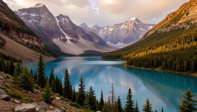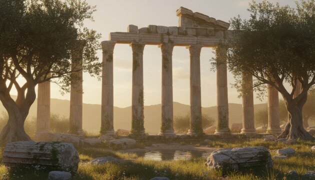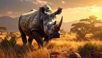 A picturesque panoramic landscape bathed in golden sunlight, featuring vibrant meadows, scattered trees, and a misty horizon during a serene sunrise