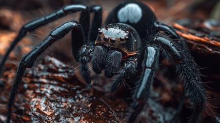 Close-up of a black spider on a piece of wood. the spider is facing towards the right side of the image and its body is covered in small hairs.