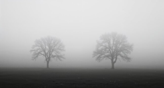 Glowing crescent moon casting halo over frosty meadow, falling snow and leafless trees