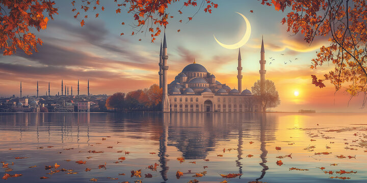 Mosque by the lake with beautiful scenic sunset sky and crescent moon