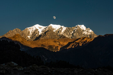 Glowing neon wireframe mountains rolling across night virtual landscape with crescent moon