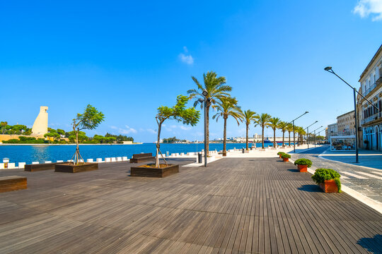 Palm trees line the waterfront boardwalk and promenade at the port harbor of Brindisi, Italy, in the Southern Puglia region