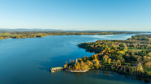 Aerial view of reflective lake with autumn trees surrounding small peninsula