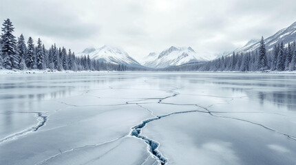 A serene lake reflects snow-capped mountains and pine trees under a cloudy sky, creating a tranquil and picturesque landscape.