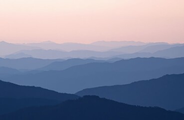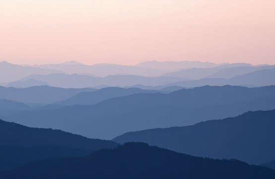 Layered blue mountains at dawn. Soft light colors, hazy atmosphere. Peaceful, tranquil view of distant mountain range. Majestic landscape with multiple layers of hills. Calm, serene scene at sunrise.