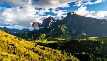 Majestic mountain range under a vast blue sky with dramatic clouds, evoking adventure and discovery