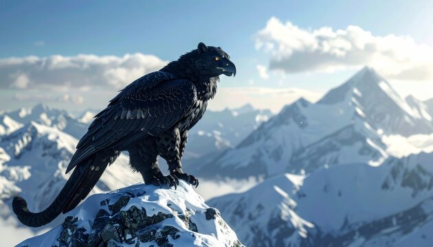 A majestic dark mythical bird perches on a snowy mountain peak overlooking a vast range of snow-capped mountains under a bright sky.