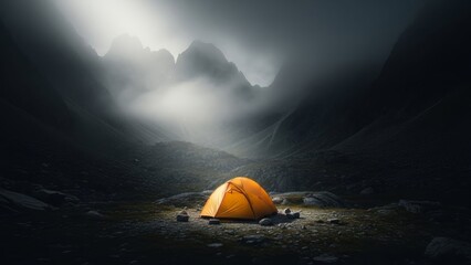 solitary orange tent nestled among dramatic mountain landscape under stormy