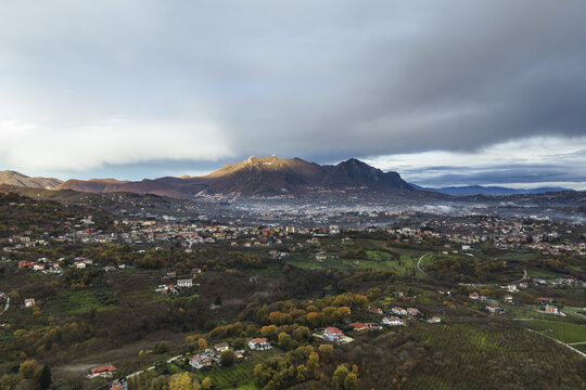 Aerial view of a sprawling landscape where buildings nestle amid rolling hills and a majestic mountain range rises in the distance under a dramatic sky, San Michele di Serino, Campania, Italy.