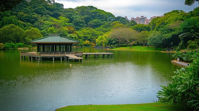 Tranquil Asian Garden With Traditional Pavilion And Serene Lake Surrounded By Lush Greenery