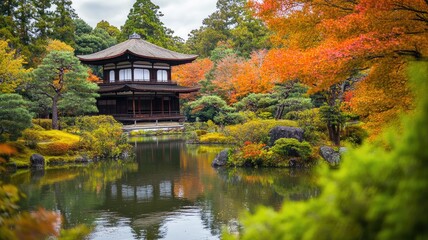 Traditional pavilion surrounded by vibrant autumn foliage and serene pond reflecting colorful trees