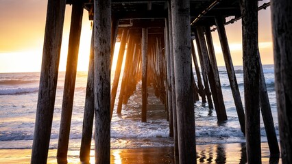 Scenic sunset over the Pacific ocean. A setting sun behind the long pier, Irvine, Orange County, California