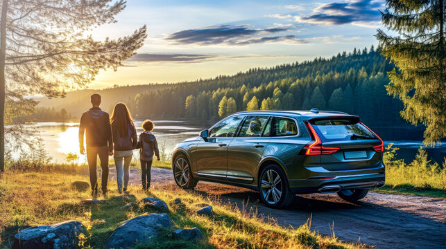 A family stands beside a modern SUV on a scenic lakeside road during sunset. Concept of family bonding and traveling, adventure in nature, evoking warmth and togetherness in an outdoor setting