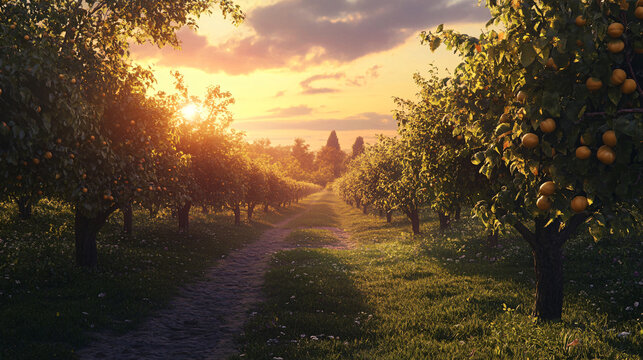 A scenic view of a chestnut orchard with the sun setting in the background.